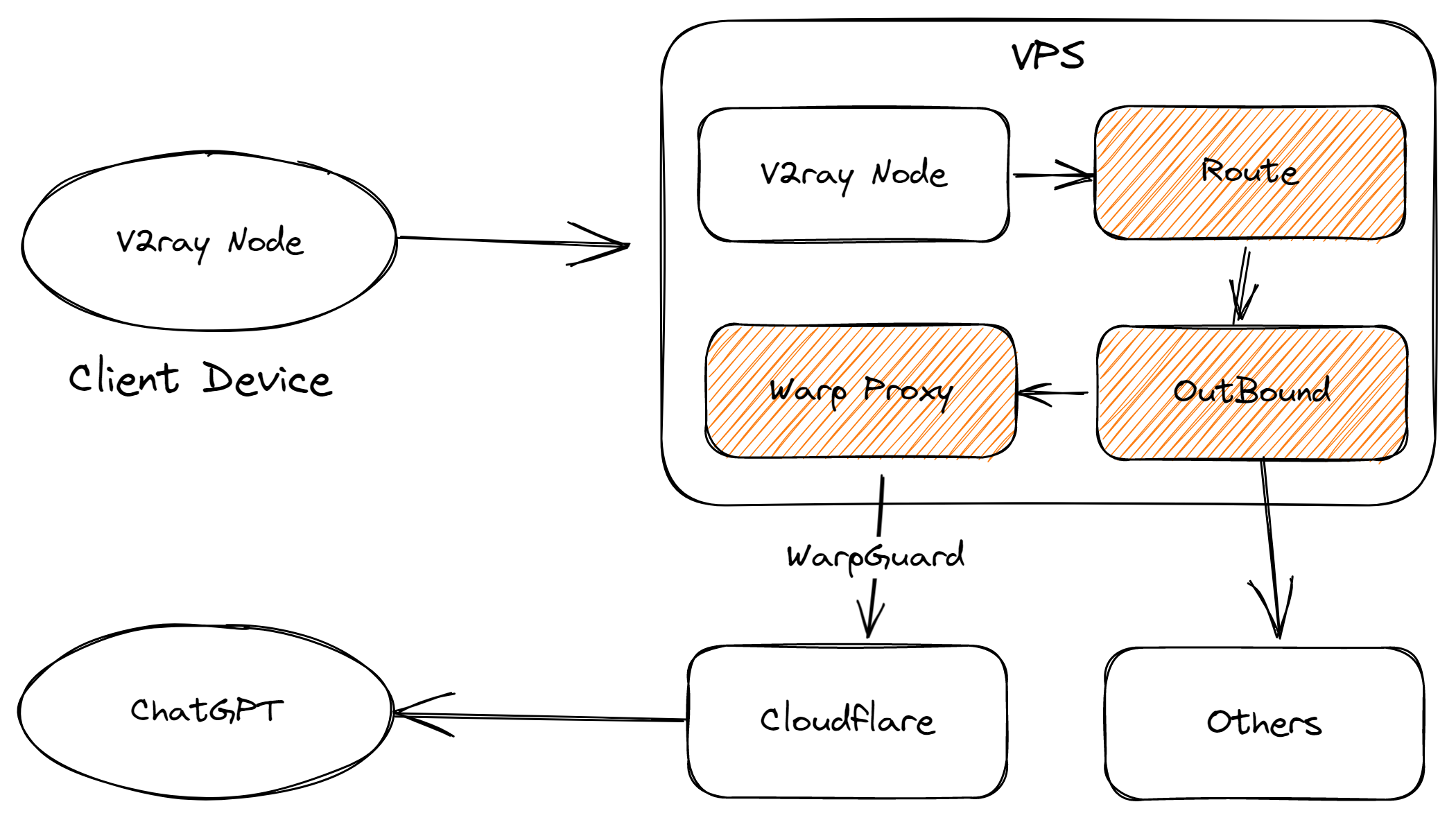 需要部署和修改的部分如上图中橙色的内容,即部署Cloudflare Warp,修改V2ray配置的Route和OutBound部分。