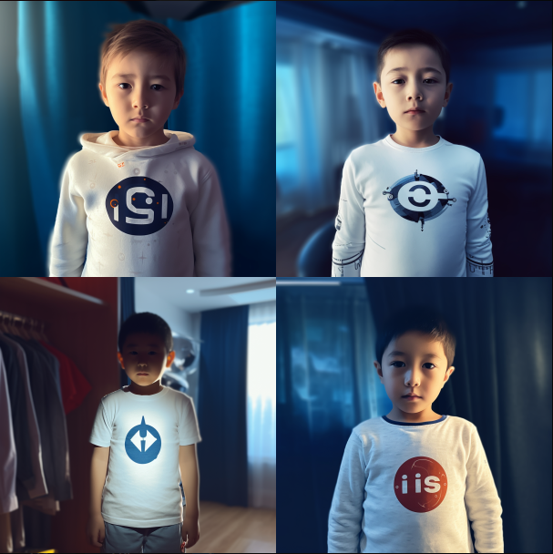 MidJourney在处理图片时无法完整处理原图,会根据原图的特点生成新的图片,且会受到原图的背景等影响,越是复杂的背景,越是无法完整呈现图片主体的内容。如上图,Logo图片在处理后生成了各种不同的Logo样式,但好在Logo确实按照Prompt中所描述出现在孩子衣服的胸口。