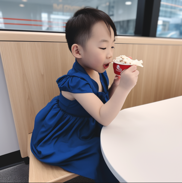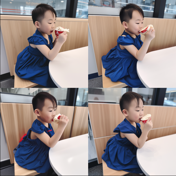 通过blue dress的Prompt,将原图中孩子的红色运动服换位了蓝色裙子,虽然长相发生了变化,但对于换装的效果还是明显的。且显然MidJourney对于人脸的识别和还原还存在很大的困难。
