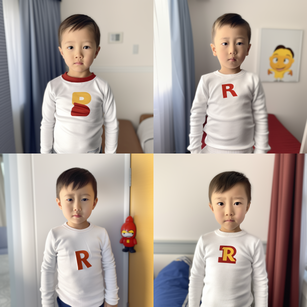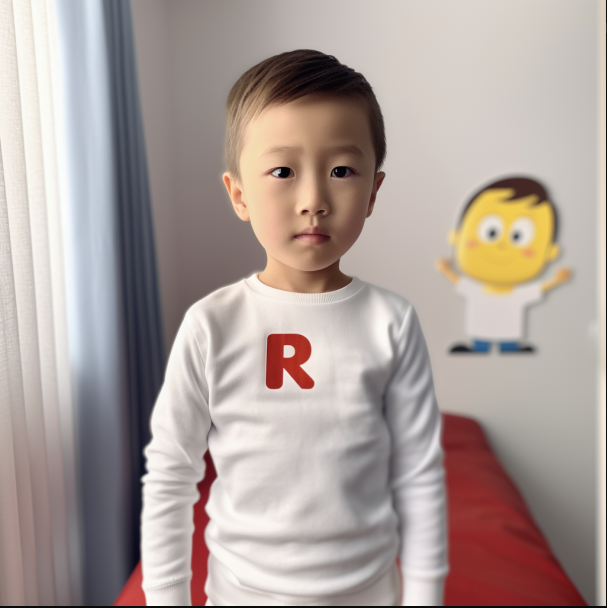 上图中是在孩子衣服胸口打印一个R的文字Logo,并且将原来的衣服颜色更换为了白色。经过几番重新生成和选择,最终效果良好的图片如下: