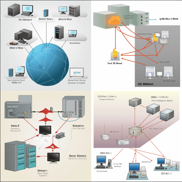 A topology diagram with routers, switches, firewalls, DMZ zones, and server devices,3d rendering