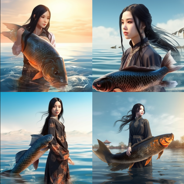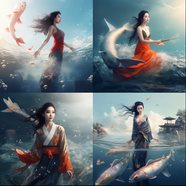 显然,上面的Prompt在图片生成过程中只能根据关键词进行拼接生成,并无法产生我们想象中美人鱼的样子,即便将Prompt做进一步的细化描述: