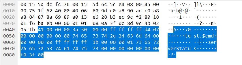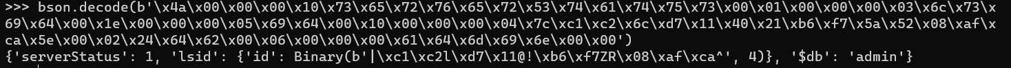 1 | \x41\0\0\0\x3a\x30\0\0\xff\xff\xff\xff\xd4\x07\0\0\0\0\0\0test.$cmd\0\0\0\0\0\xff\xff\xff\xff\x1b\0\0\0\x01serverStatus\0\0\0\0\0\0\0\xf0\x3f\0 |
