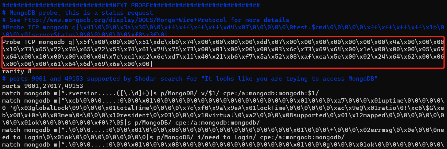 上面代码中的request值就是发送至服务端的OP_MSG消息,可以用于替换nmap-service-probe文件的指纹信息。